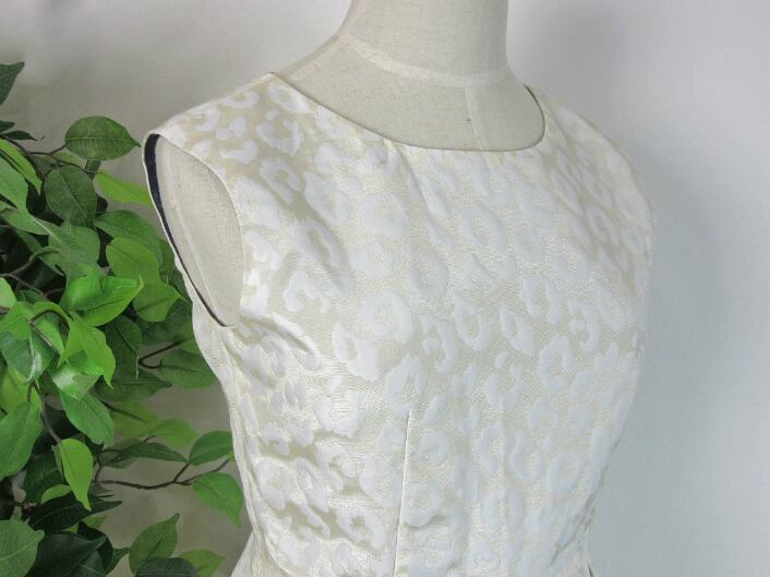 7号Мサイズモデル・151cmの私には膝丈の上品な長さです。上半身はコンパクトな作りなのでぴったりサイズ。ウエスト位置を高めに設定してあるのでバランス良く見えるようになっています。張りのある生地を使用しているので、ペチコートなしで自然なふんわり感が出て